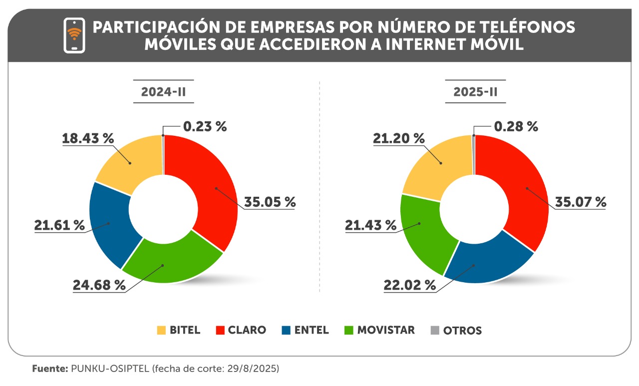 En cuanto a la participación de empresas operadoras por el número de teléfonos móviles que accedieron a internet móvil, a junio de 2025, Claro tuvo una participación de mercado de 35.07 %. seguida de Entel (22.02 %), Movistar (21.43 %), Bitel (21.20 %), y otras empresas (0.28 %).