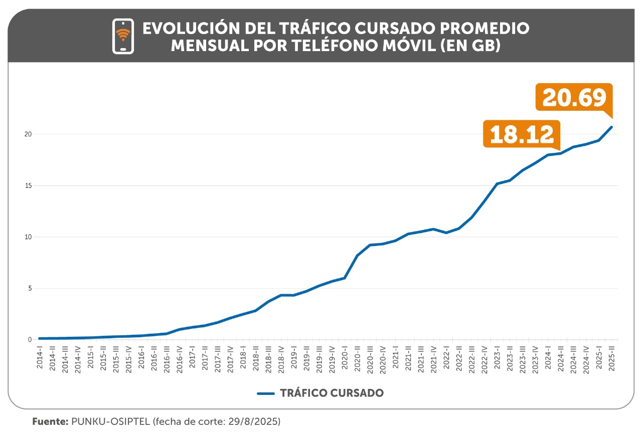 El acceso a internet móvil desde teléfonos móviles en el Perú continúa en ascenso. Al cierre del segundo trimestre de 2025, el consumo promedio mensual de datos de internet móvil desde teléfonos móviles se situó en 20.69 gigabytes (GB), lo que significó un avance de 14.18 % respecto al promedio de similar periodo de 2024 (18.12 GB), informó el Organismo Supervisor de Inversión Privada en Telecomunicaciones (OSIPTEL).