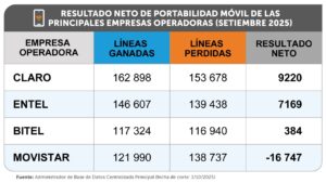 En setiembre de 2025, 548 916 líneas móviles cambiaron de empresa operadora a nivel nacional, lo que significó un incremento de 1.04 % respecto a las portaciones móviles registradas en el mismo periodo del año pasado (543 278), informó el Organismo Supervisor de Inversión Privada en Telecomunicaciones (OSIPTEL).