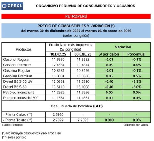 Los precios de los combustibles en el país registraron nuevos ajustes tras la última actualización de Petróleos del Perú (Petroperú). De acuerdo con información difundida por el Organismo Peruano de Consumidores y Usuarios (Opecu), se reportaron reducciones en el diésel B5 S-50 y leves variaciones en los precios del gasohol y las gasolinas, mientras que el gas licuado de petróleo (GLP) se mantuvo sin cambios en Planta Talara.
